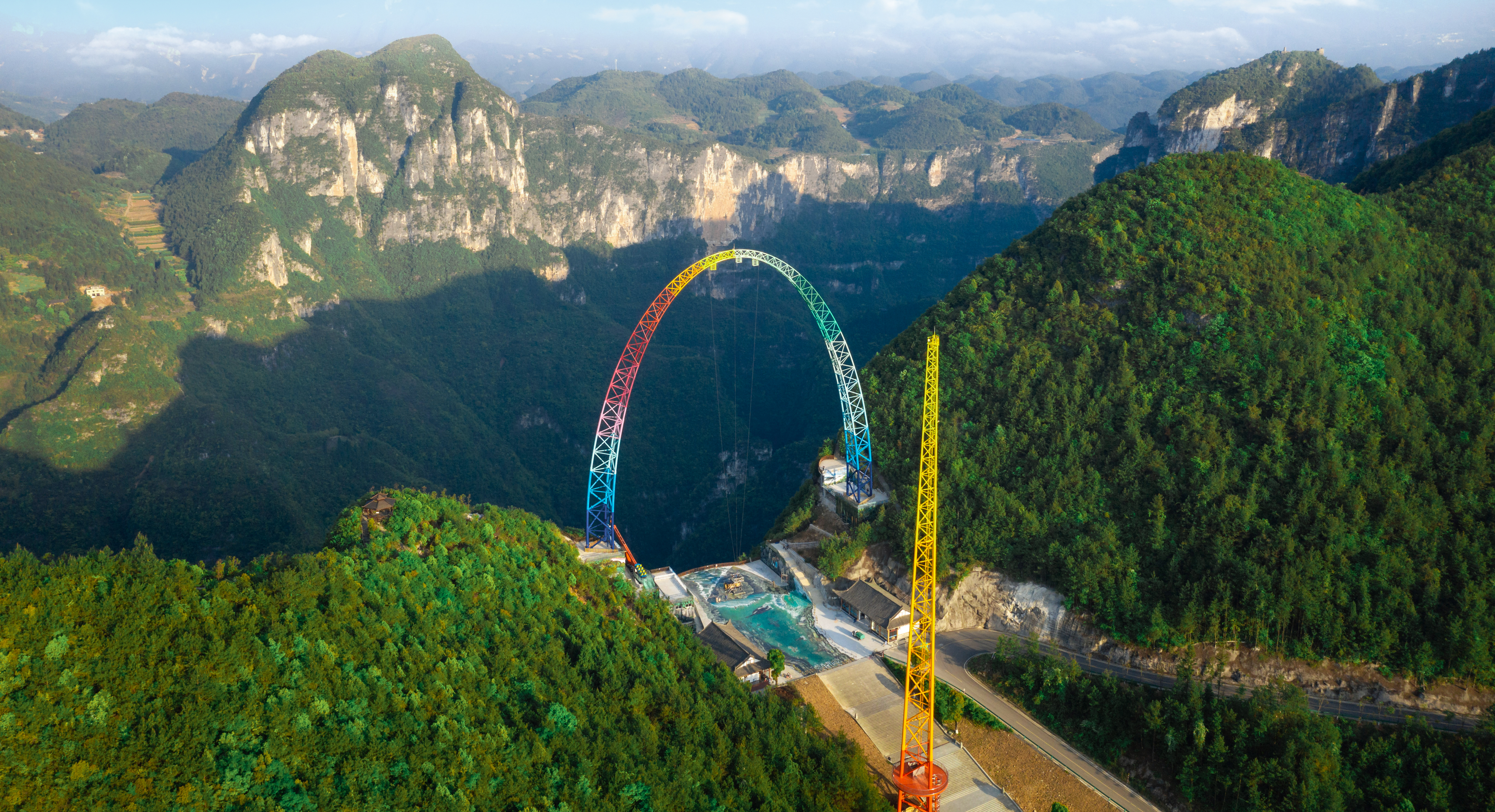 由中冶設(shè)備院自主研發(fā)、設(shè)計、制造、安裝的云端彩虹秋千,坐落于重慶龍缸5A景區(qū)700米的懸崖邊緣,主體由高100米、基礎(chǔ)跨距87.6米的彩虹涂裝拱形塔和高108米的提升發(fā)射塔等部分組成,該設(shè)備最大提升高度88m,最大運行速度可達(dá)130km/h,以“世界最高的框架秋千”稱號被載入吉尼斯世界紀(jì)錄。